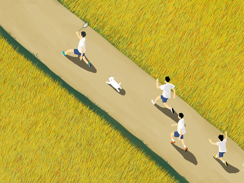 강아지에게 쫓기는 주인공과 그 뒤를 따라 뛰어가는 친구들입니다. 그리고 옛날 농부가 벼를 수확하던 마음으로 하나하나 가을 벼를 그려보았습니다.