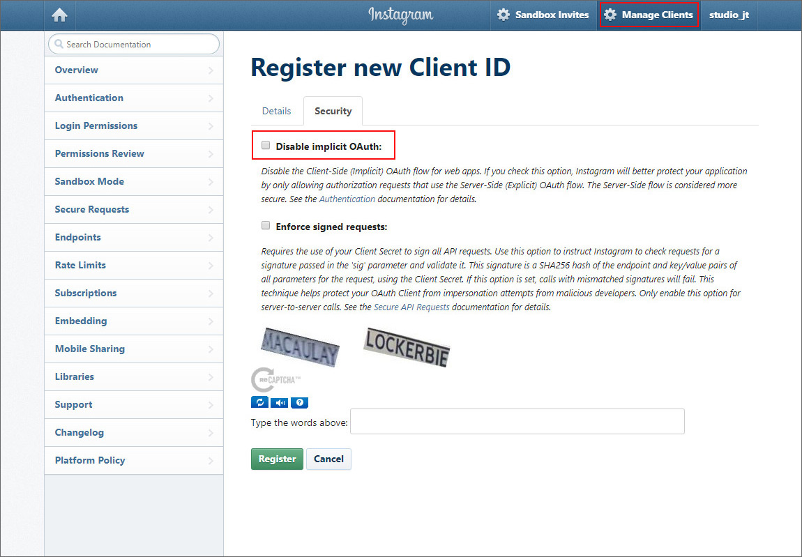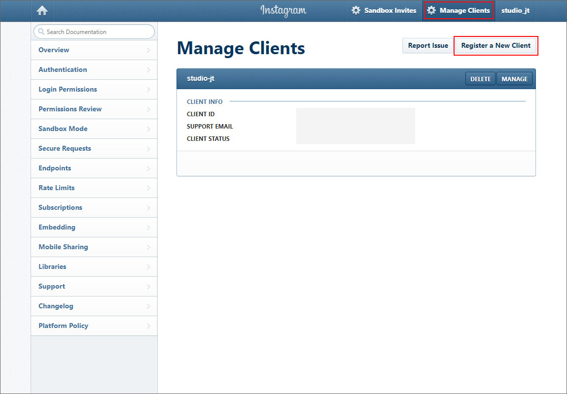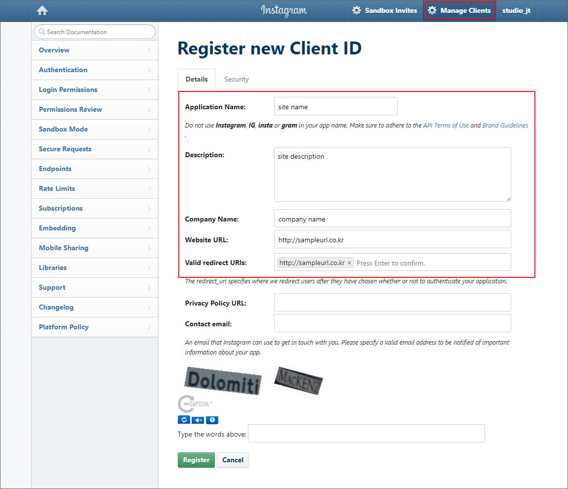 https://www.instagram.com/developer/로 접속하여 로그인한 후, Manage Clients -> Register a New Client로 이동하여 인스타그램을 연동할 새 클라이언트를 등록합니다.