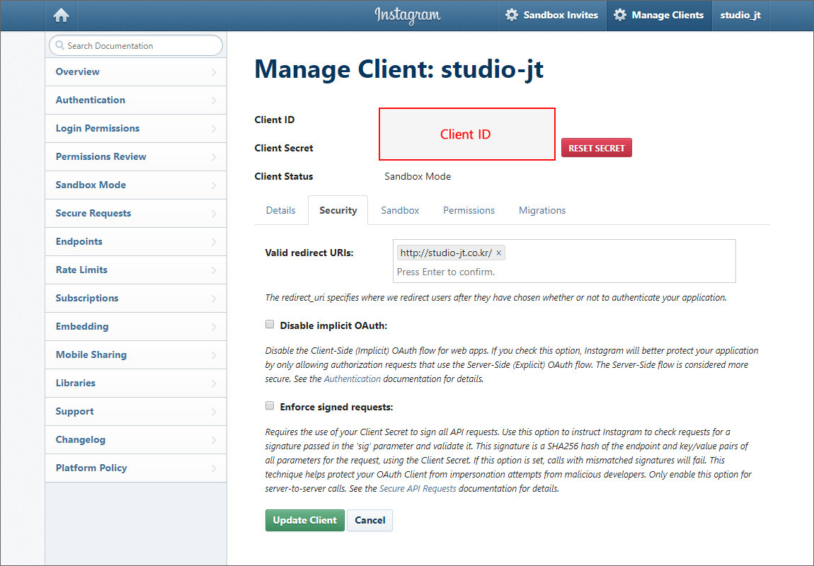 [Security]탭에서 Disable implicit OAuth체크박스를 해제(인스타그램 데이터를 전체공개로 웹사이트에 삽입할 수 있도록하기 위함)한 후, 클라이언트 등록요청을 합니다.