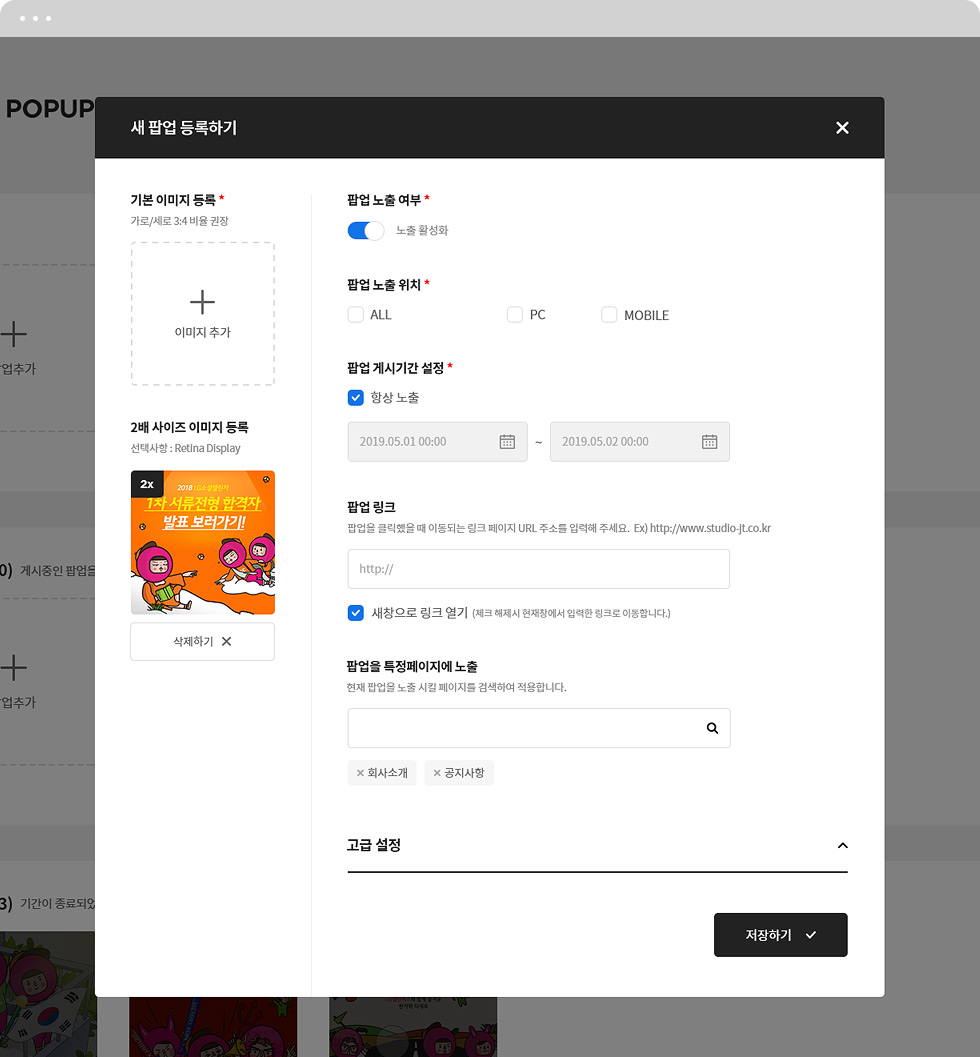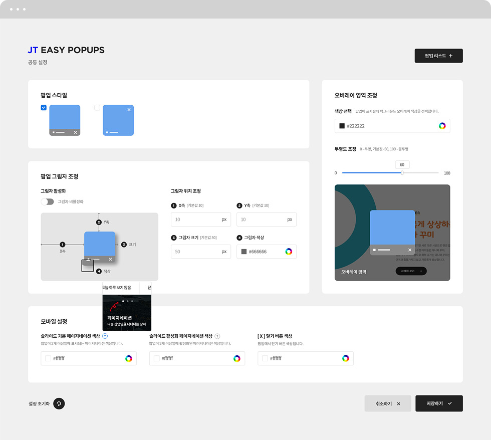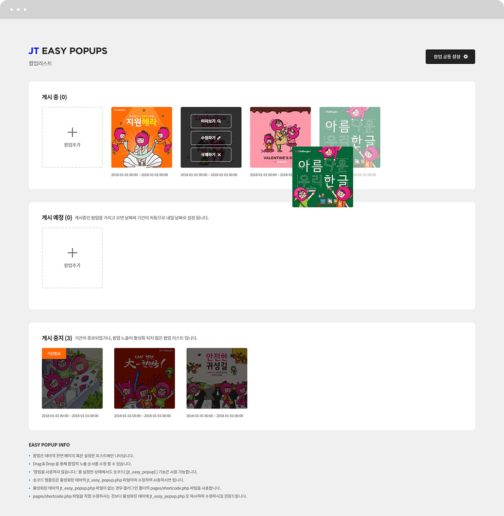 아래 스크린샷을 통해 팝업의 주요 제공 기능을 확인 하시고 필요 하신 워드프레스 유저분들은 자유롭게 사용하시길 바랍니다.