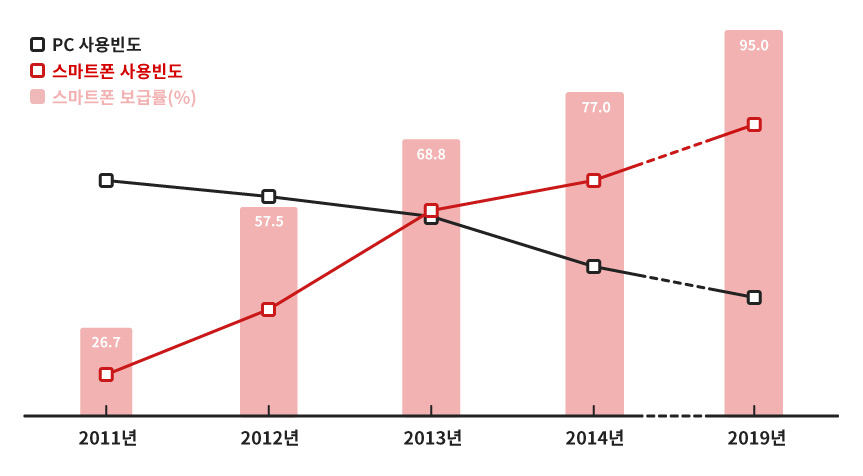 현재 스마트폰은 1인당 평균 1개 이상의 스마트폰을 가지고 있을 정도로 보급이 되어 있고, 무겁고 휴대가 불편한 PC와 달리 언제 어디서든 사용 할 수 있다는 장점이 있어 사용량이 급속히 증가하게 되었고, 2013년을 기준으로 스마트폰의 사용빈도가 PC 사용빈도를 넘어섰습니다. 더불어 2019년 한국이 스마트폰 보급률이 95%로 세계 1위를 기록하면서 반응형 작업은 매우 중요한 부분을 차지하게 되었습니다.