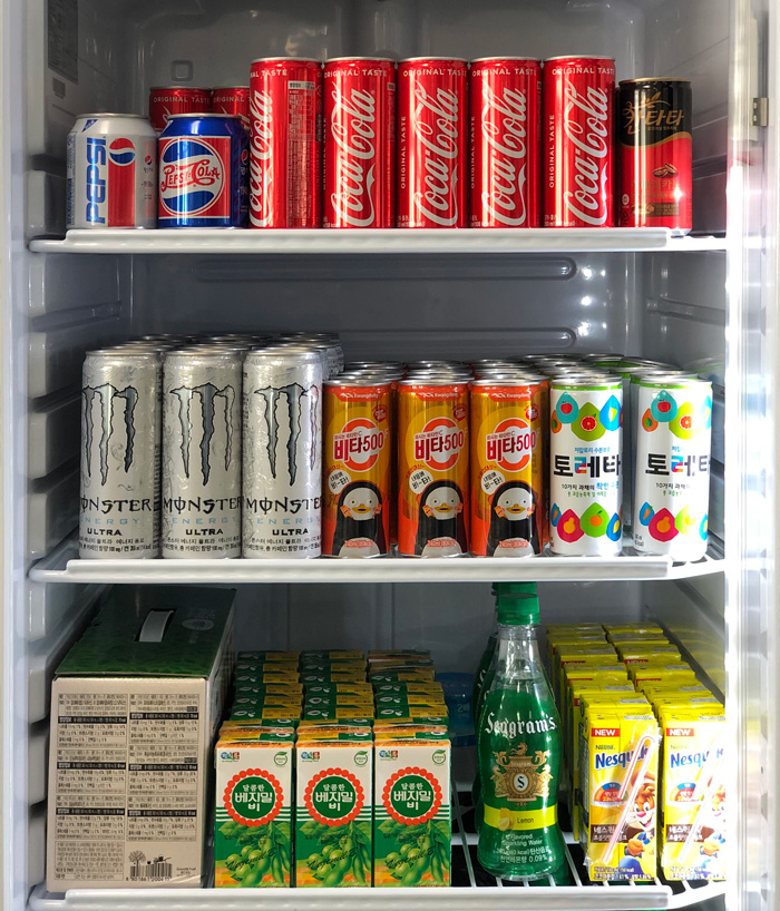 음료 냉장고에는 탄산음료, 커피, 에너지 드링크, 이온음료, 유제품 등 다양하게 주문을 하고 있습니다.??
