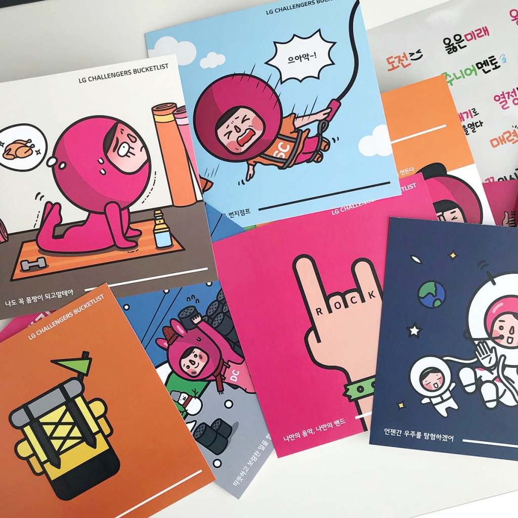 이 엄청난 양들에서 스티커 한장, 이모티콘 한장, 그리고 버킷리스트 등등.. 총 14장을 엽서에 넣으면 매거진이 됩니다!