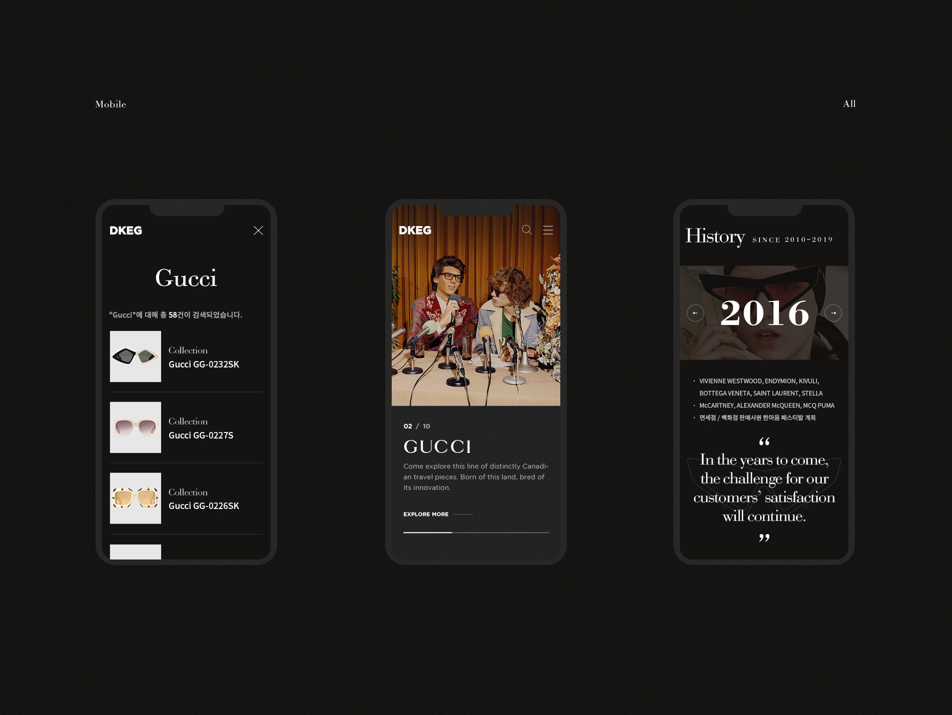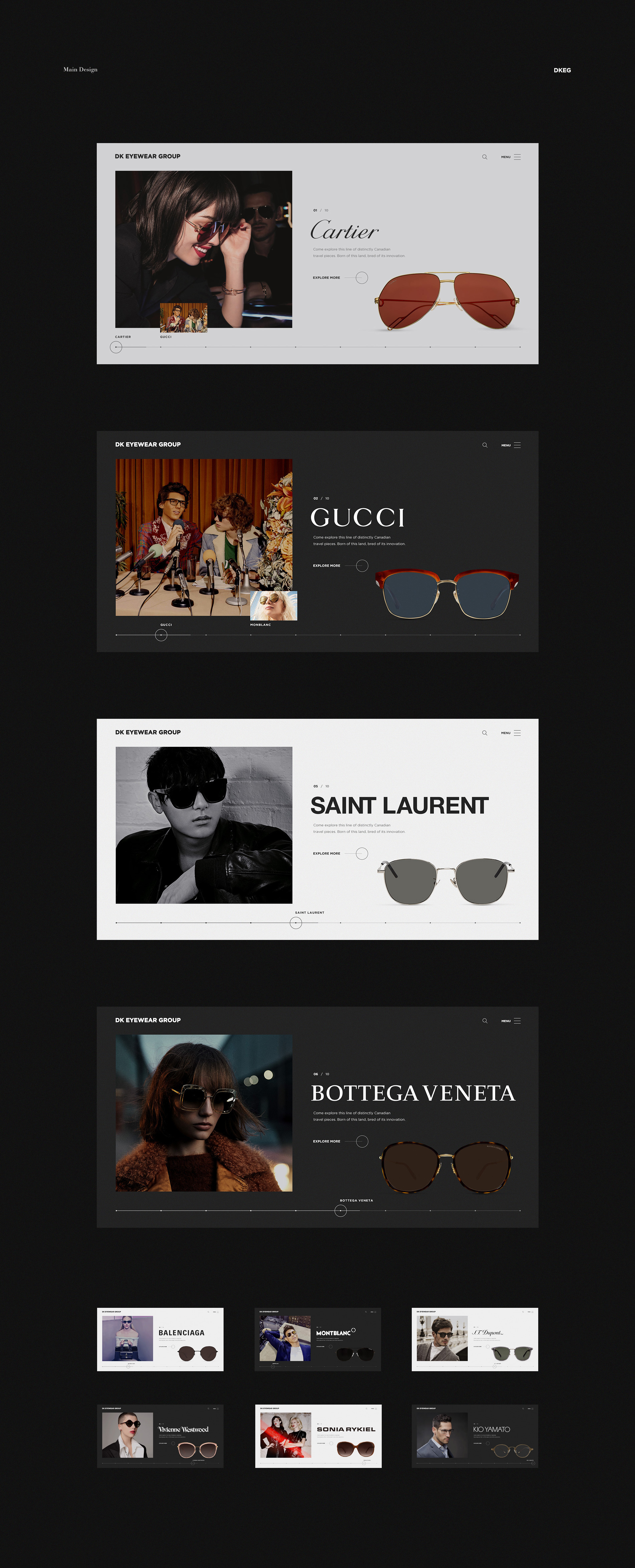 메인은 가로형 원스크롤 방식의 대담하고 시원한 레이아웃을 사용하였고, 충분한 여백을 표현 할 수 있는 넓은 그리드를 사용하였습니다. 원스크롤 방식을 통해 사용자들이 브랜드 하나하나에 집중할 수 있도록 하였고, 손쉽고 빠르게 정보를 알 수 있도록 하였습니다.