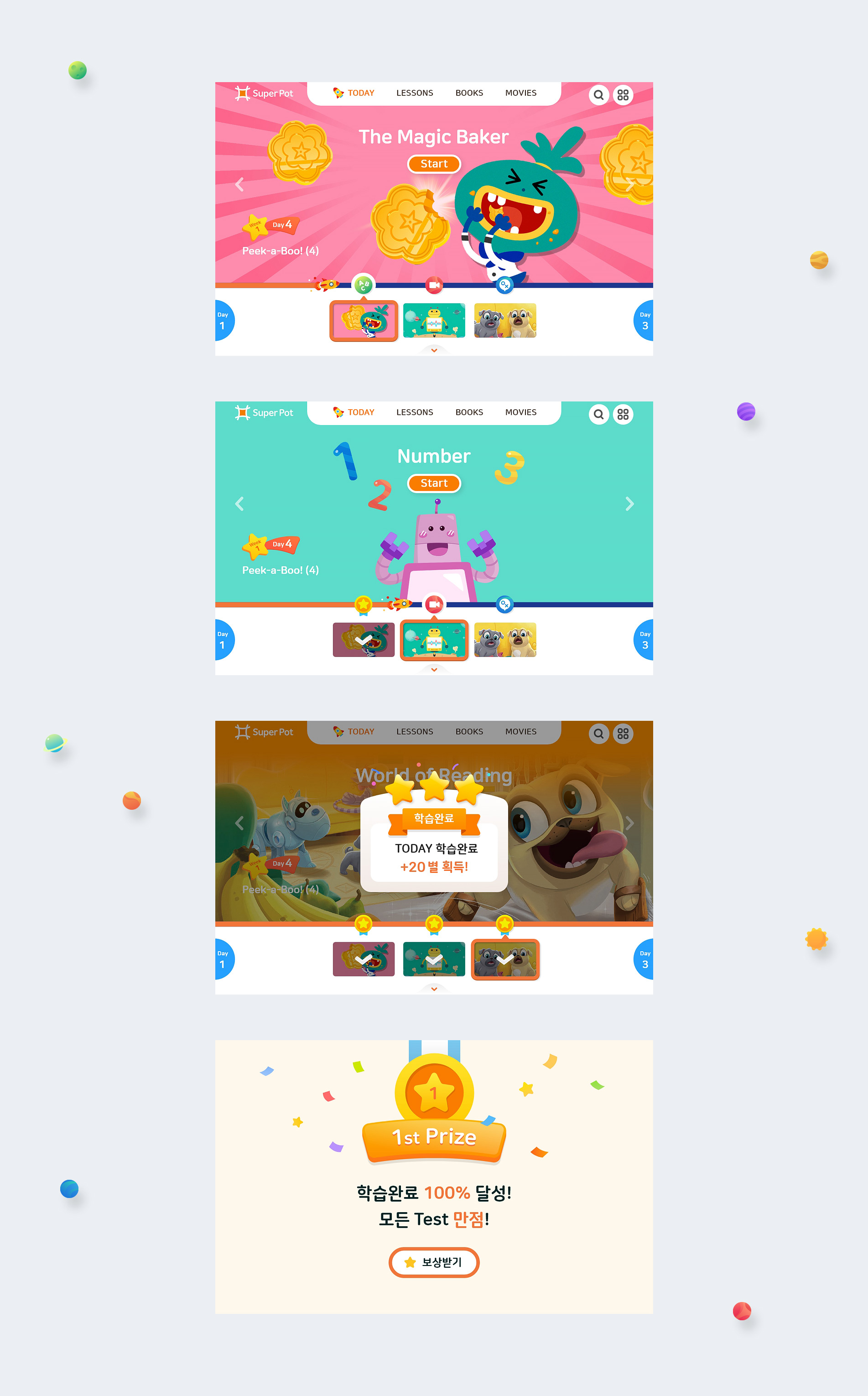 균형있는 학습에 다채로운 차기로 구성된 각 콘텐츠를 마치 게임을 하는 듯한 그래픽요소로
