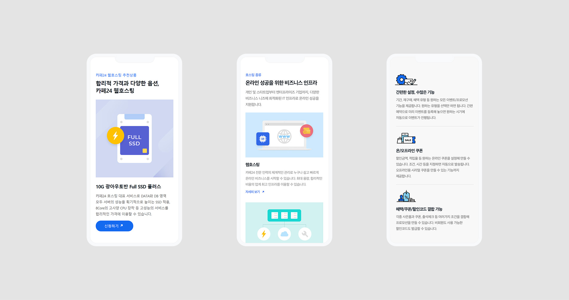 콘텐츠를 쉽게 이해할 수 있도록 직관적인 카페24 만의 일러스트 아이콘을 제작하였습니다.