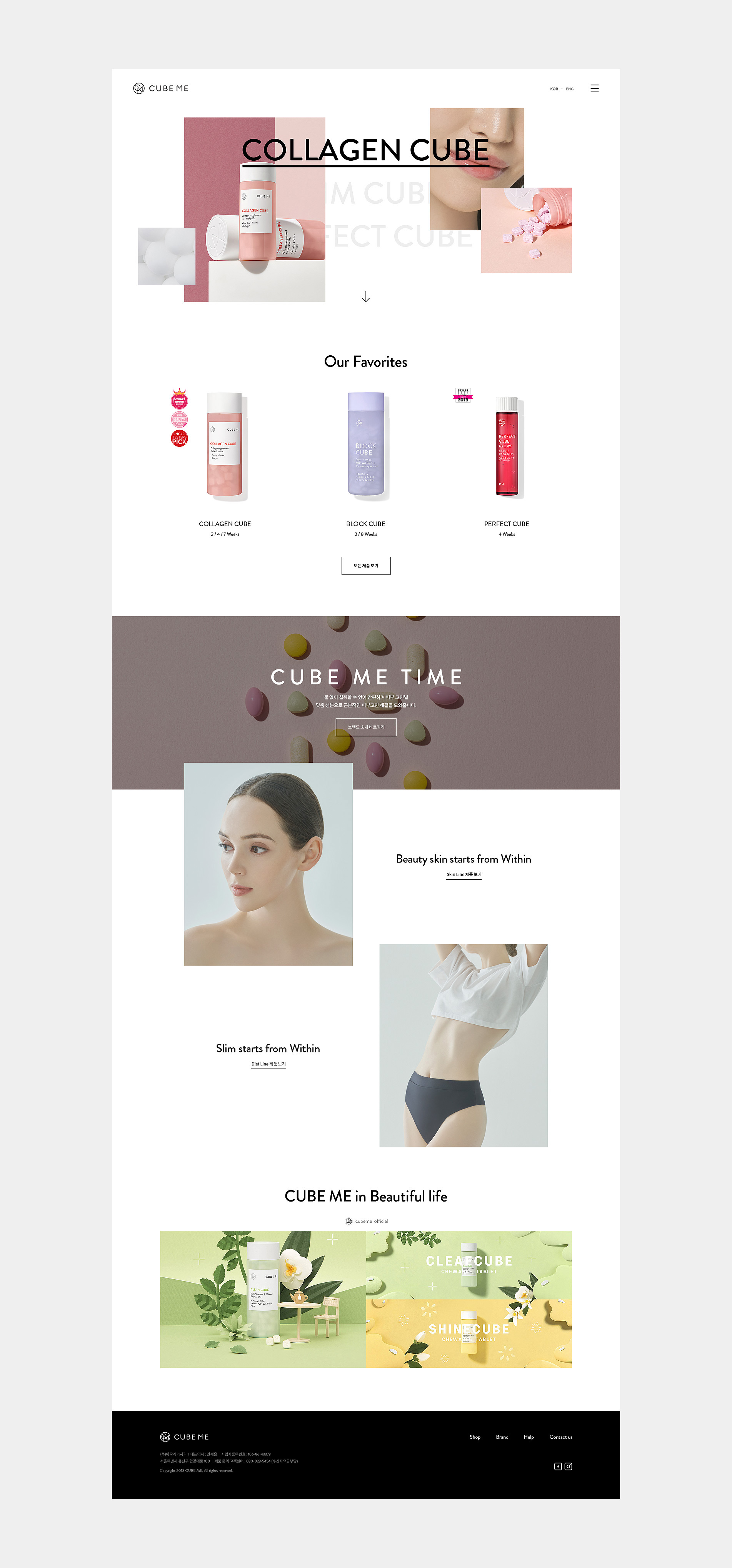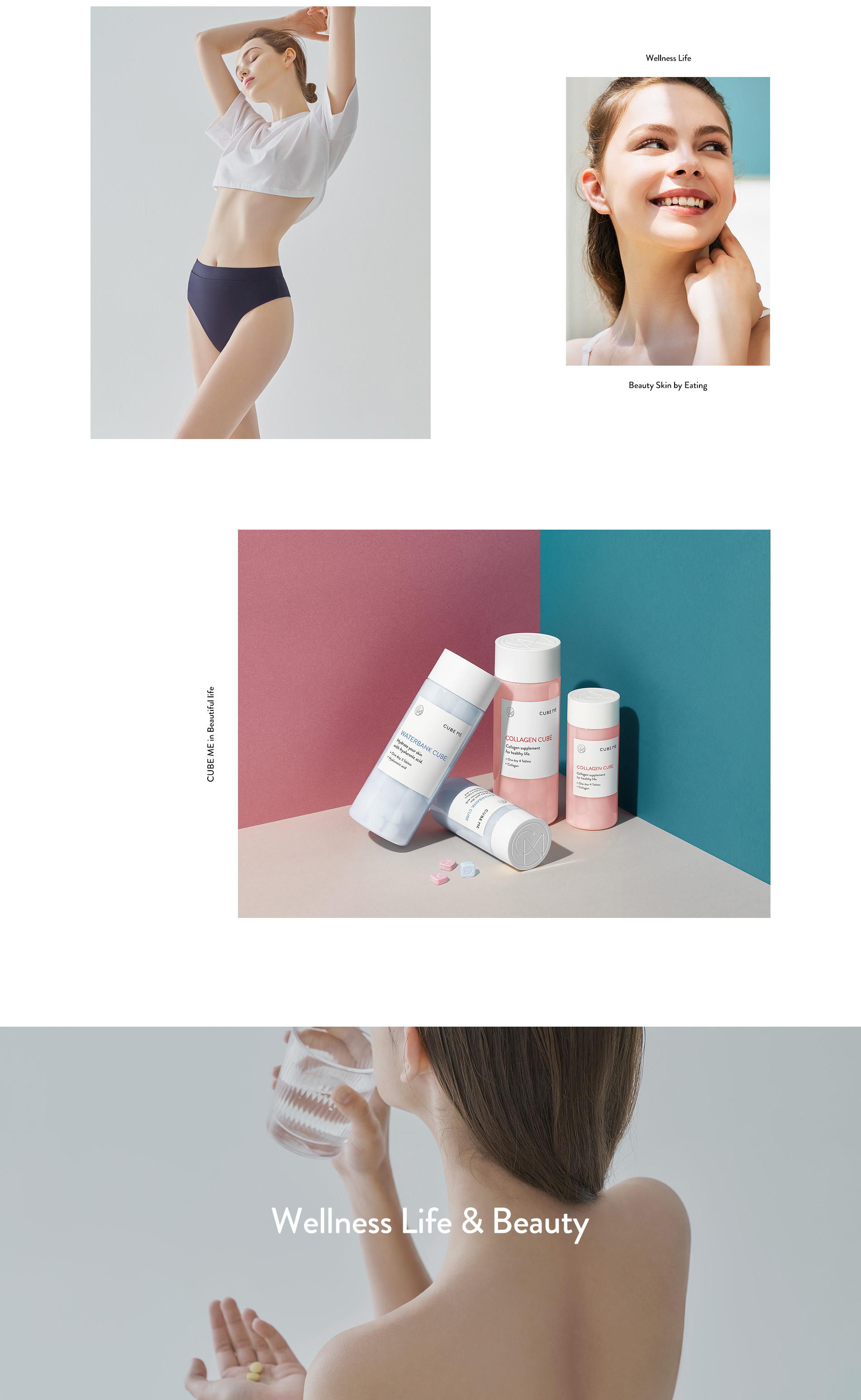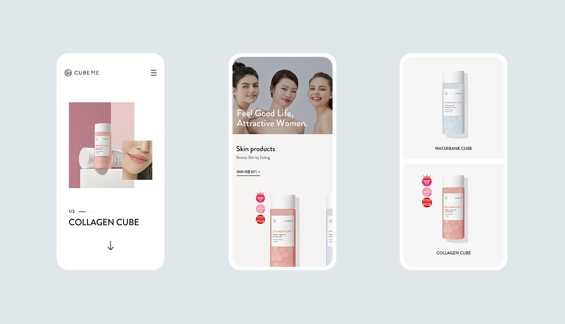 모델컷과 제품컷을 활용한 감각적인 디자인은 큐브미의 아이덴티티를 더욱 강조시킵니다.