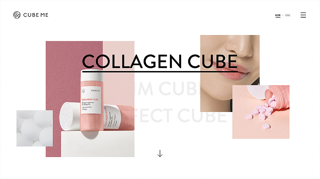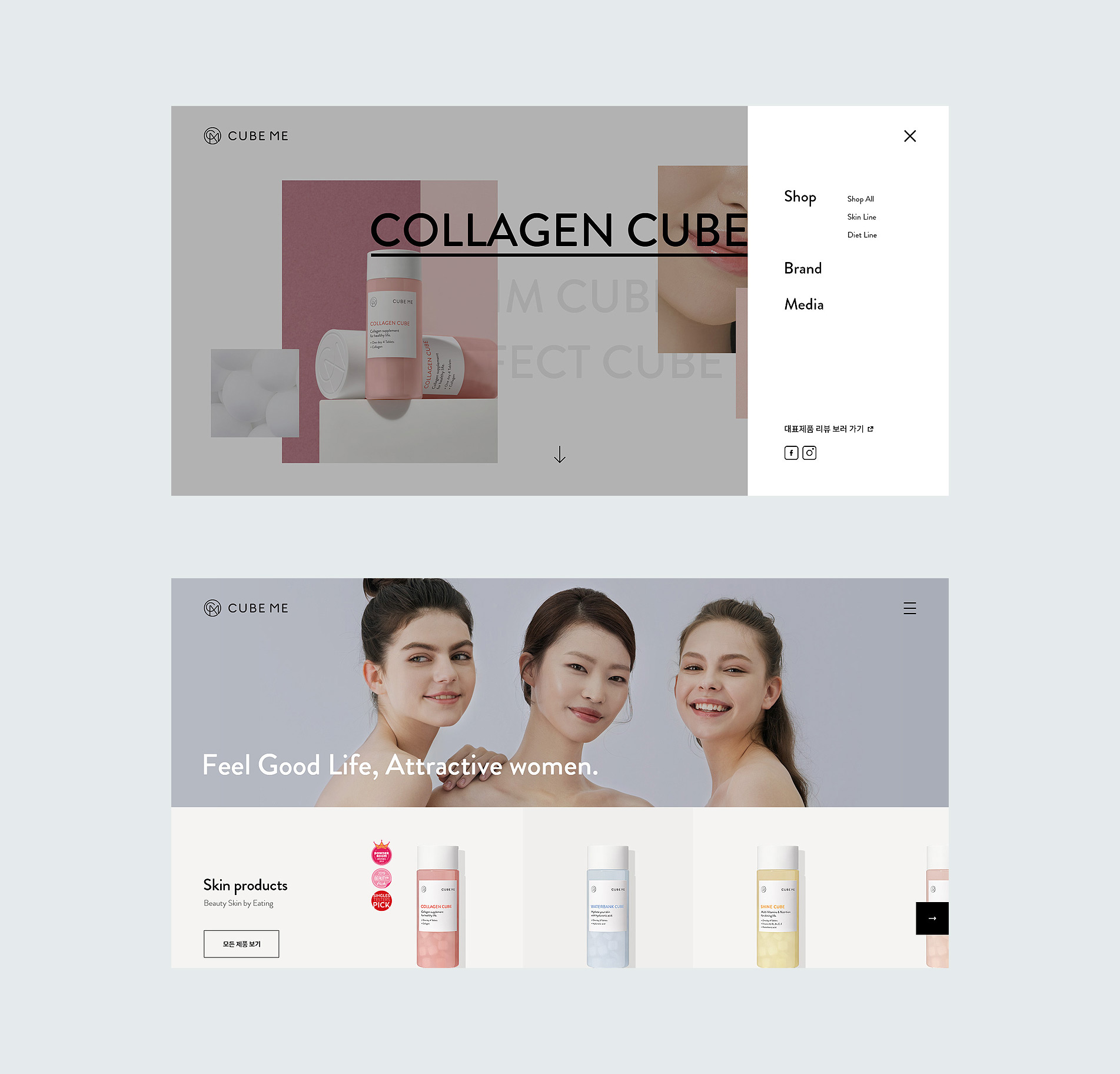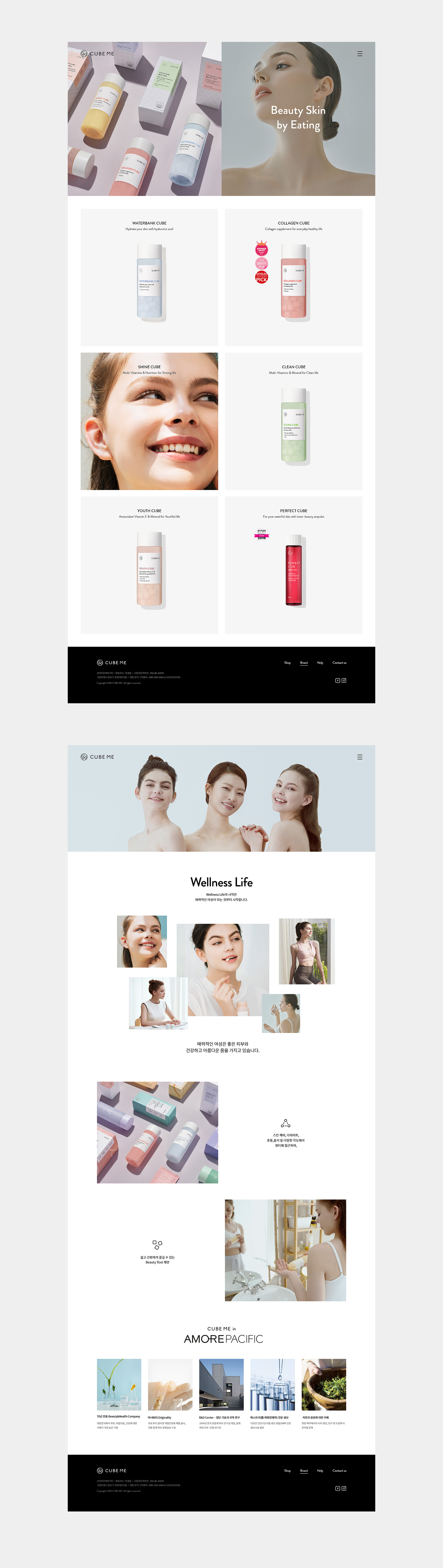 모델컷과 제품컷을 활용한 감각적인 디자인은 큐브미의 아이덴티티를 더욱 강조시킵니다.