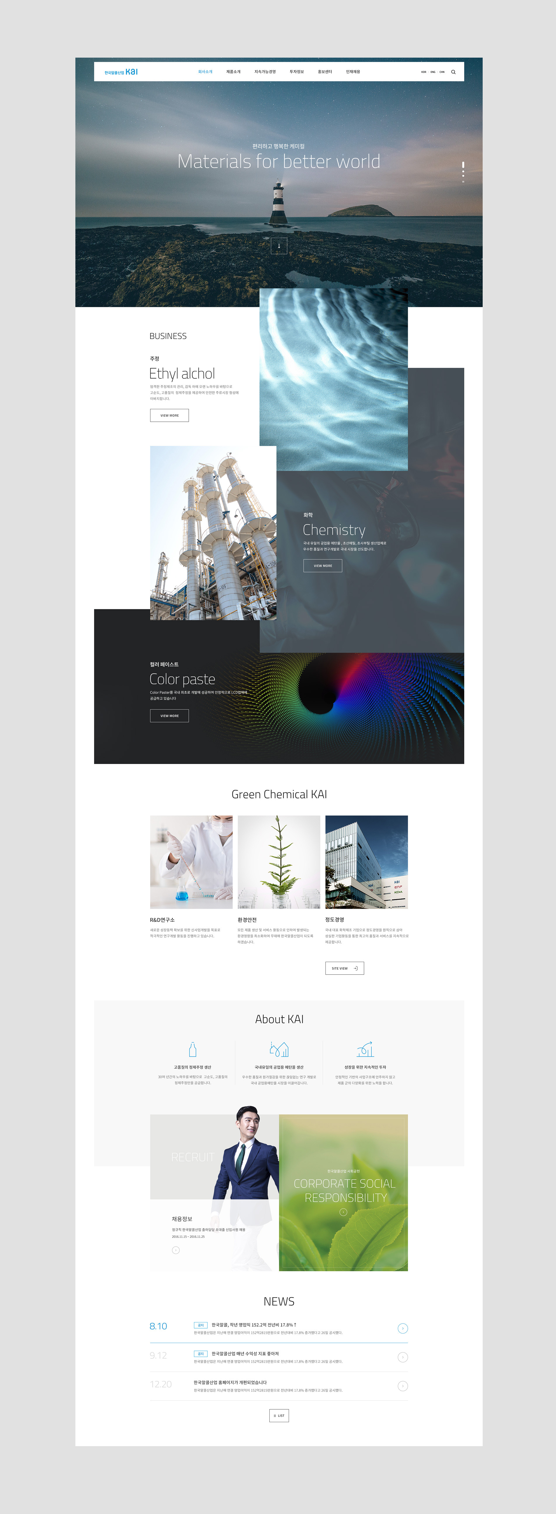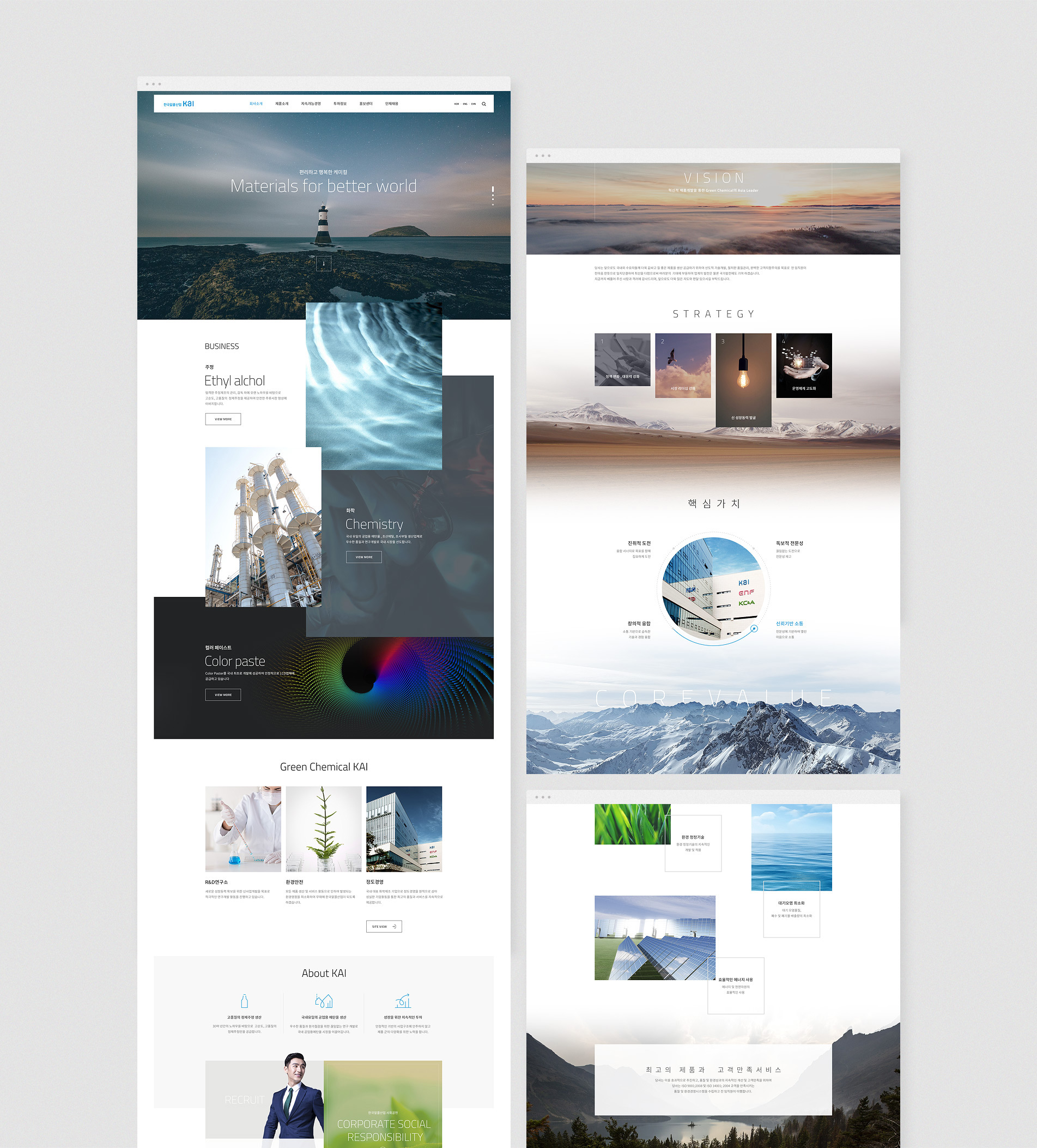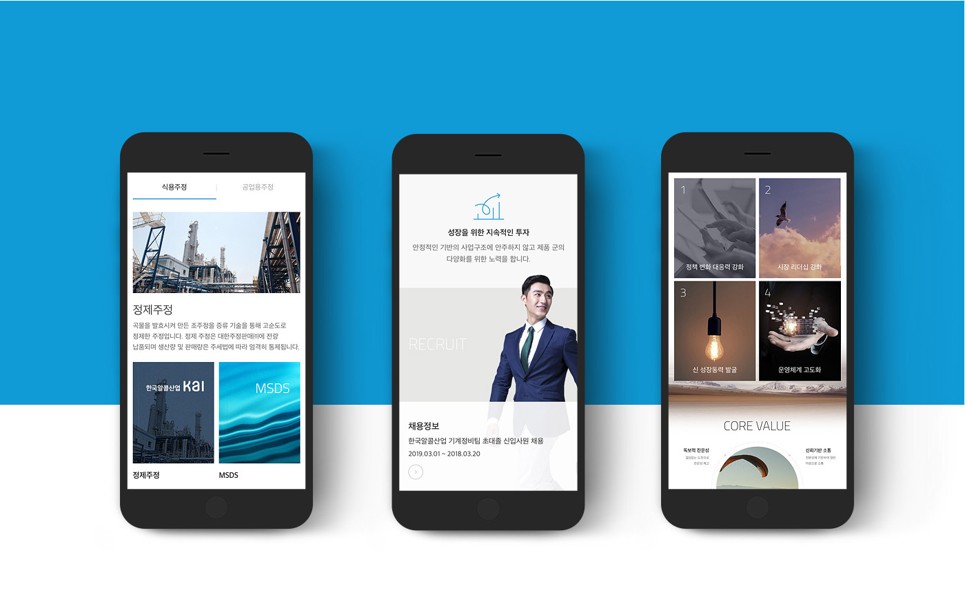 전체적인 톤&매너는한국알콜산업의 새로운 비전인 "혁신적 제품개발을 통한 Green Chemical의 Asia Leader"와 기업이미지를 잘 나타낼 수 있도록 세련되면서도 자연스럽고 친화적인 이미지가 내재되도록 하였습니다.