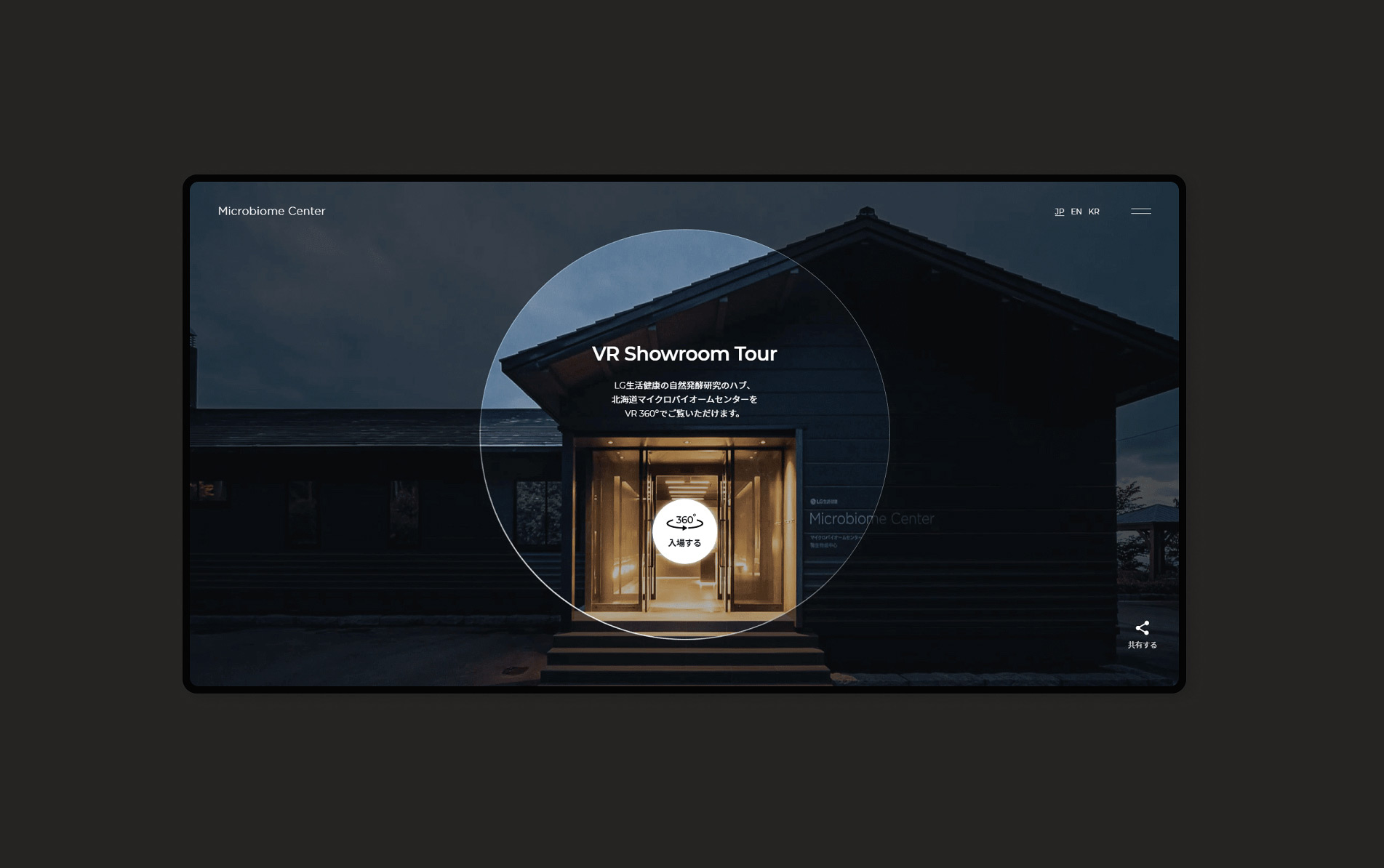 홋카이도 오타루에 위치한 마이크로바이옴 센터의 내부 공간을 360º VR로 관람할 수 있도록 온라인 서비스하고 있습니다. 웹사이트에서는 센터 내부에 배치된 홍보 콘텐츠와 전시물에 대해 자세하게 안내하고 있습니다.