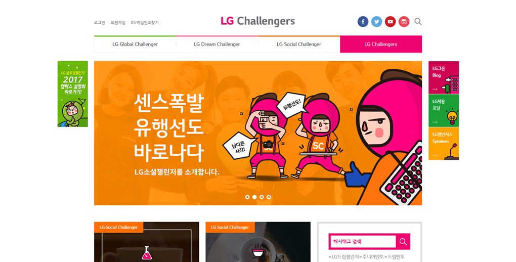 최신 트렌드를 반영한 콘텐츠 최적화 디자인을 구현하였으며 심플한 내비게이션과 깔끔하고 명확한 인터페이스 활용으로 사용자 관점에서 페이지 이동을 최소화 하고 편의성과 심미성 모두를 충족 시키도록 제작하였습니다. 캐릭터와 아이콘을 적극 활용하여 엘지 챌린저스만의 아이덴티티를 확립하였습니다.